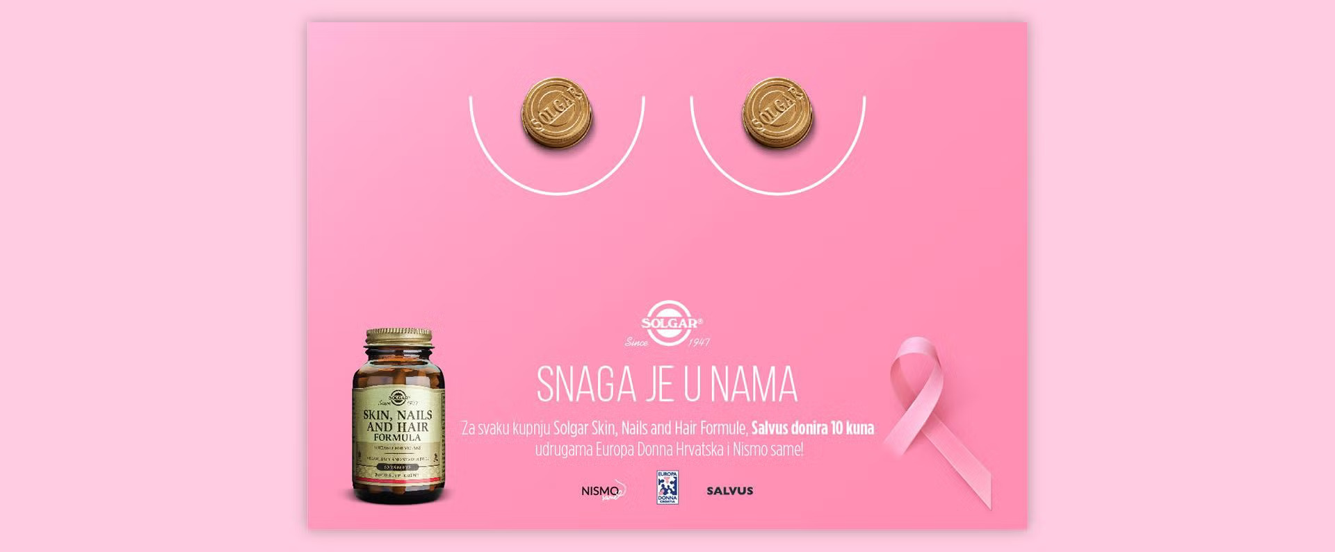 U listopadu nabavite Solgar Skin, Nails and Hair Formulu u bilo kojoj ljekarni, a od svake prodane bočice, donirat ćemo 10 kuna udrugama Europa Donna Hrvatska za psihološku pomoć oboljelima od karcinoma dojke i Nismo same za projekt besplatnog prijevoza taksijem na kemoterapiju.
